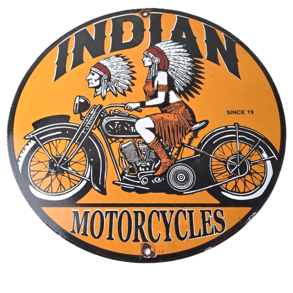 Description This vintage Indian Motorcycles porcelain sign is made of porcelain and measures 12″. This Indian Motorcycle sign is perfect for displaying