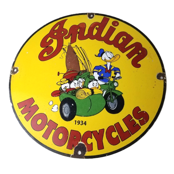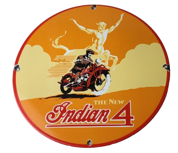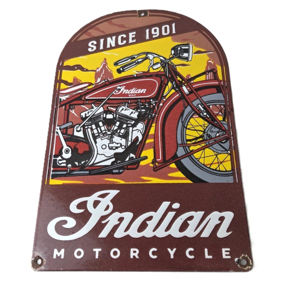 Description This vintage Indian Motorcycles porcelain sign is made of porcelain and measures 12″. This Indian Motorcycle sign is perfect for displaying