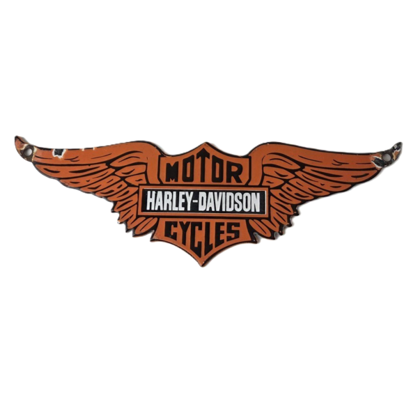 This vintage porcelain sign showcases the iconic Harley Davidson Motorcycles company with the Harley chicken wings. Measuring at 12″ by 4″, this Harley sign is a must-have for any gas & oil or collectibles enthusiast. The bold orange & black colors make this sign a standout piece of advertising for any man cave, collector, motorcycle shop, or garage.