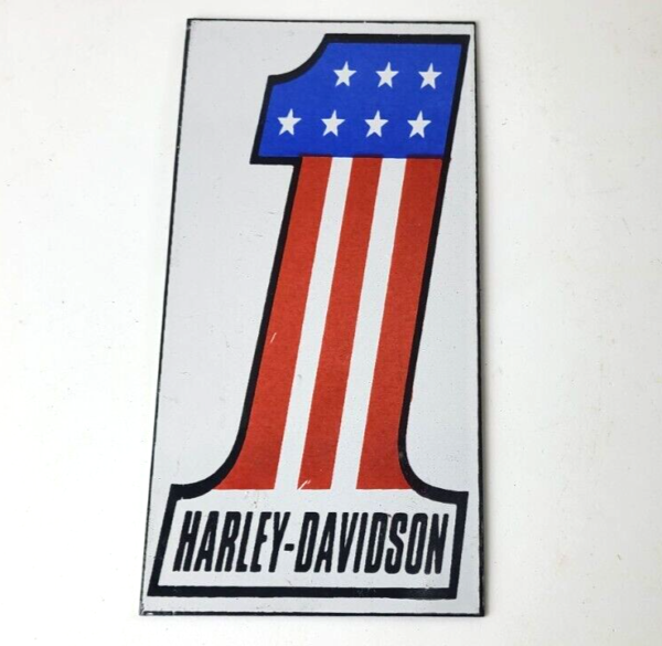 This vintage porcelain sign showcases the iconic Harley Davidson Motorcycles company with a patriotic American flag design. Measuring at 8″ by 4″ and featuring the classic #1, this Harley sign is a must-have for any gas & oil or collectibles enthusiast. The bold red, white, and blue colors make this sign a standout piece of advertising for any man cave or garage.