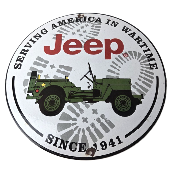 This vintage porcelain sign features Jeep vehicles in army green color with the words “4 Wheel Drive” and “Vehicles” in bold letters. The sign is made in the United States and measures 11 3/4 inches in size. It is a great addition to any gas and oil or advertising collectibles collection.