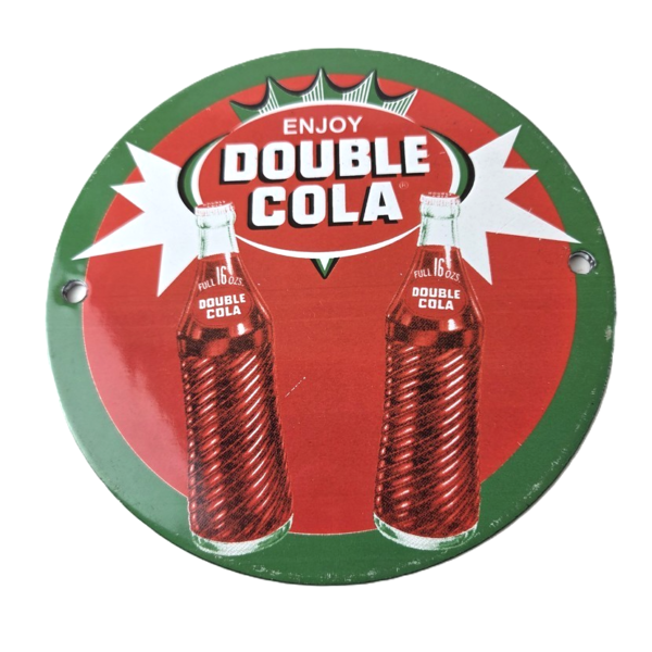 Add a vintage touch to your bar, man cave or soda collection with this stunning porcelain sign featuring the iconic Double Cola glass bottle advertising. The red & green color and gas & oil theme make it a perfect addition to any vintage advertisement collection.