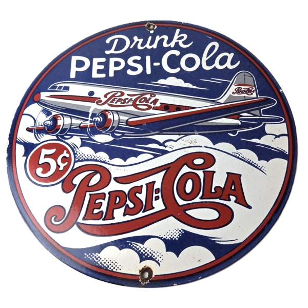Vintage Pepsi Porcelain Sign – 5 Cent Airplane Ad Drink Soda Cola Sign