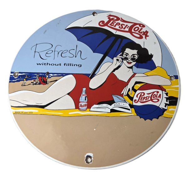 Description This vintage Pepsi Cola porcelain sign features the iconic Pepsi logo on a bottle cap and a beach umbrella with the