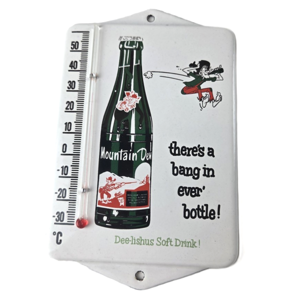 Description Vintage Mountain Dew Porcelain Thermometer sign.  This vintage Mountain Dew thermometer is a must-have for any collector of hunting