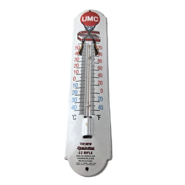 Description This vintage Remington UMC porcelain thermometer measures 11 3/4″ x 2 1/2″. This thermometer is a great addition to any
