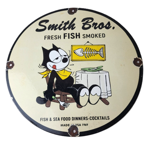 Vintage Smith Bros Sign – Felix the Cat Fish Meat Porcelain Gas Pump Sign