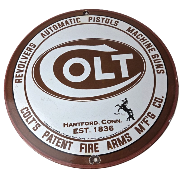 Add a vintage touch to your gas station or collection with this eye-catching Colt Firearms porcelain sign. Featuring a brown design, this 12-inch sign is a must-have for any gas and oil or advertising enthusiast. The sign showcases the iconic Colt pistols and guns graphic, making it a unique and collectible item for fans of the brand and theme. Whether you’re looking to decorate your man cave, she shed, bar or garage, or simply add to your collectibles, this porcelain sign is an excellent choice.