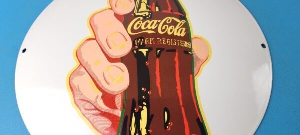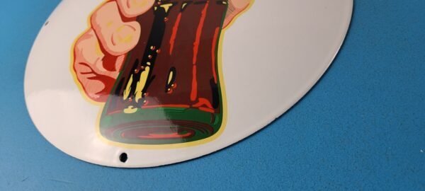 This vintage Coca Cola brand porcelain sign is a true gem for any collector of soda memorabilia. The sign features the iconic Coca Cola logo in a vibrant color scheme, making it a perfect addition to any soda-themed decor.