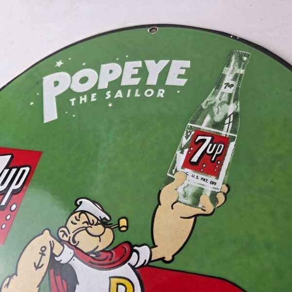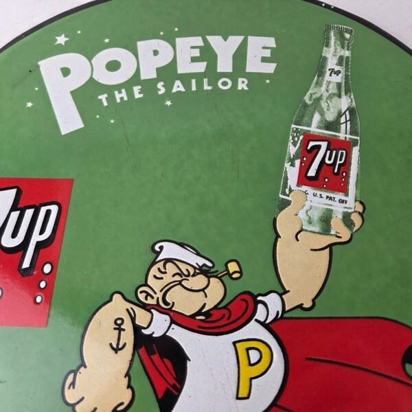 This is a vintage 7 Up Soda Porcelain sign measuring 12″. This sign is perfect for any soda or gas themed space. Made of porcelain on both sides, this sign features Popeye holding a glass bottle of 7 Up Soda. This sign is perfect for collectors of all kinds, whether you’re a fan of Popeye or just love the vintage aesthetic. Display it in your home bar, game room, man cave, or garage.