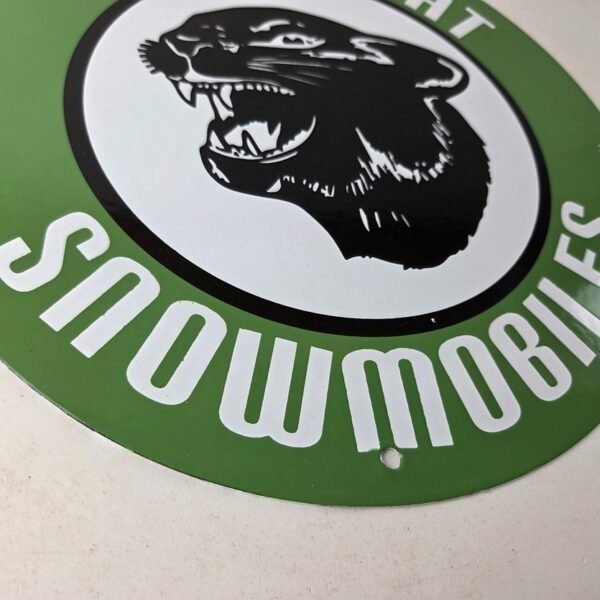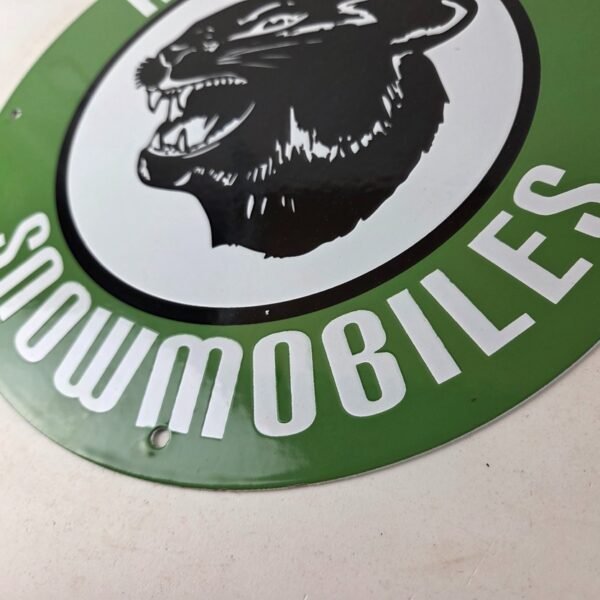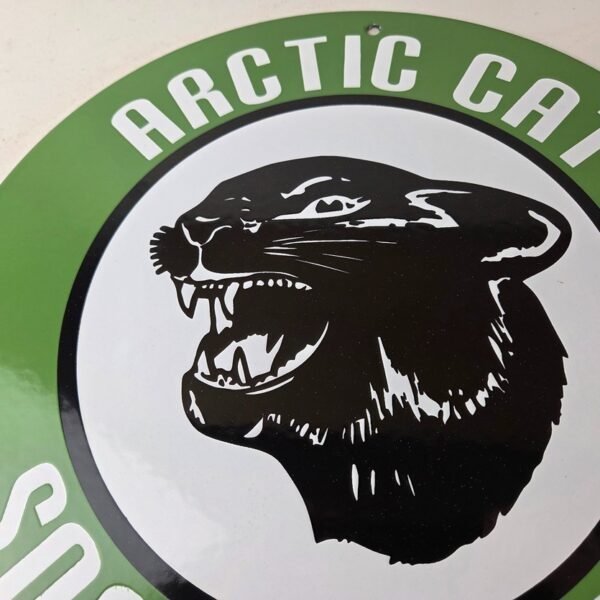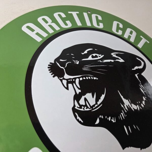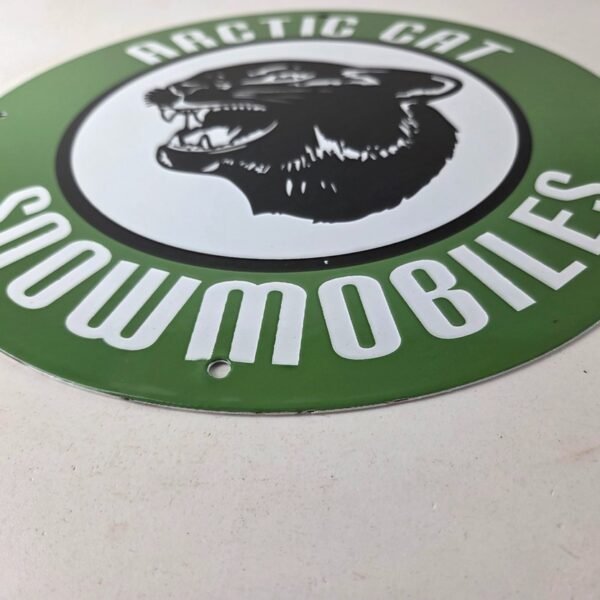 This vintage Arctic Cat Snowmobiles porcelain sign features a striking design with bold black & green colors and is made of porcelain material. The sign measures 11 3/4″ and is in excellent condition, with no major chips or cracks (other than around the mounting holes).