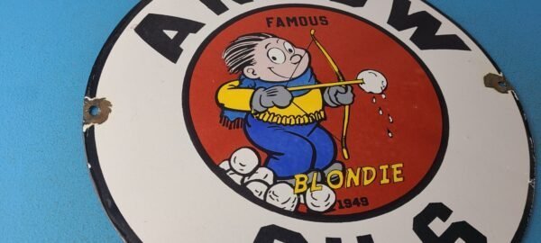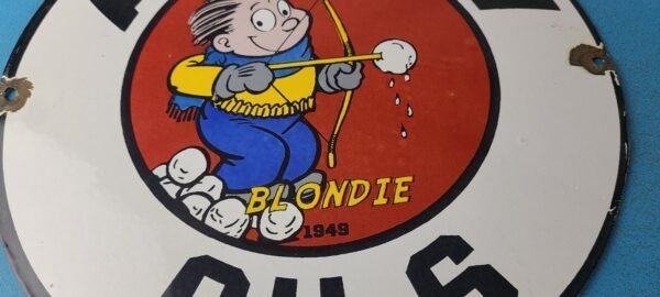 This vintage porcelain sign features Blondie character. The sign measures 12 inches and has a colorful design with excellent porcelain. It is a great piece of gas and oil advertising memorabilia for collectors, retro man cave decor or your shop or garage. The sign is in excellent condition and can be combined with other items for shipping at a rate of $5 per additional item.