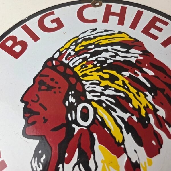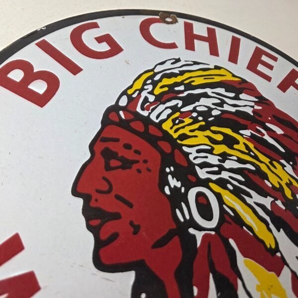 This vintage porcelain gas pump sign features the iconic Big Chief Bread brand.