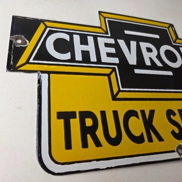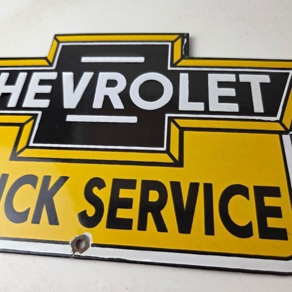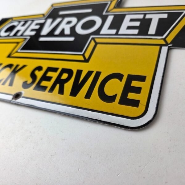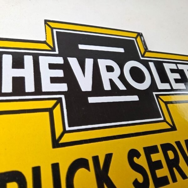 This vintage Chevrolet porcelain sign features the Chevrolet Service Bow-Tie Sign. The porcelain service sign features a vibrant dark color scheme with yellow that will add a pop of color to any garage or man cave.