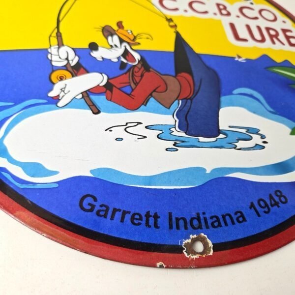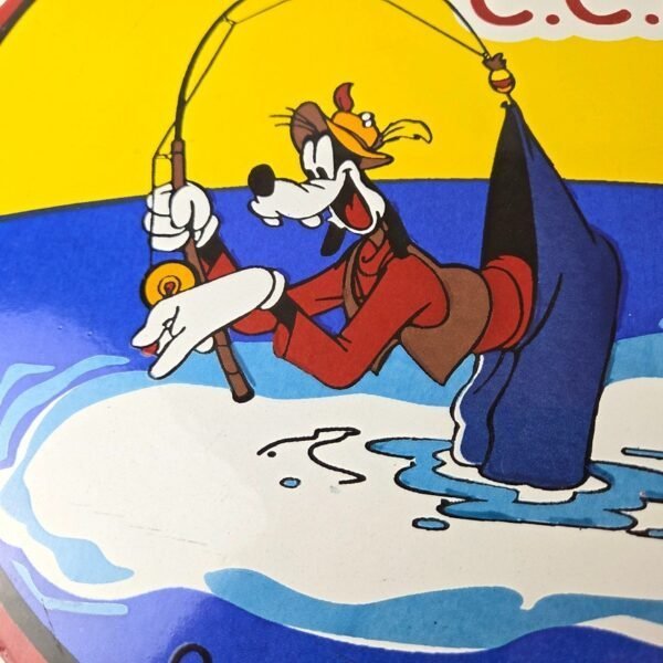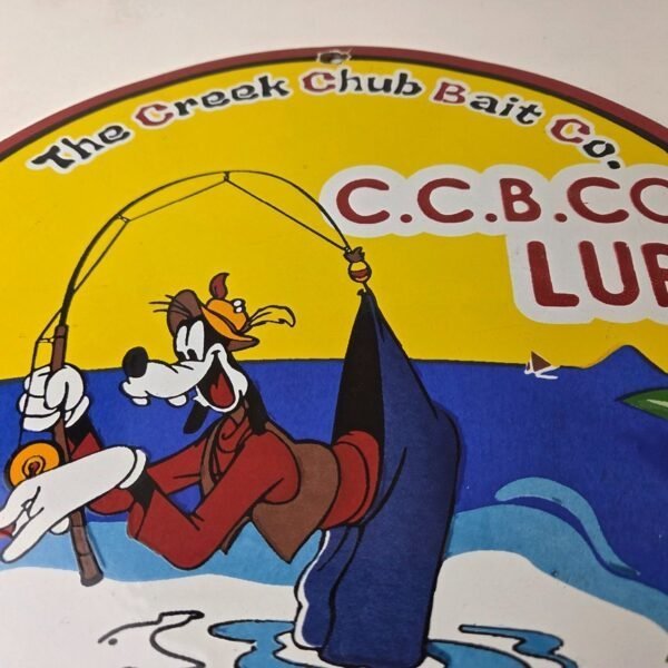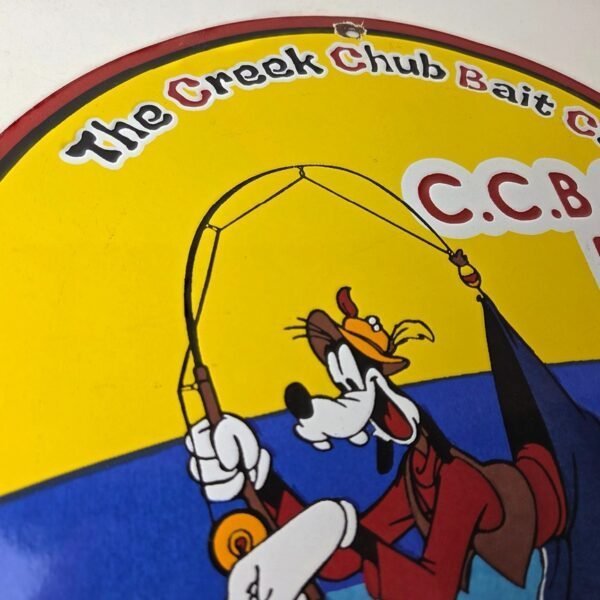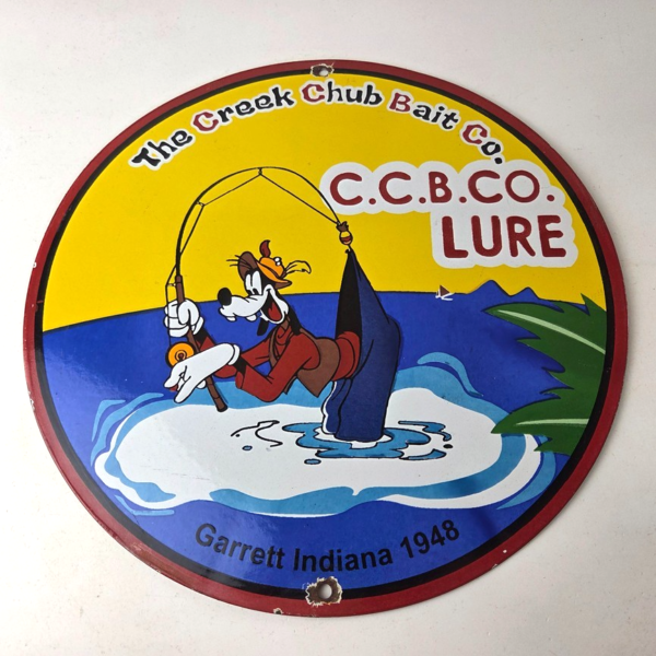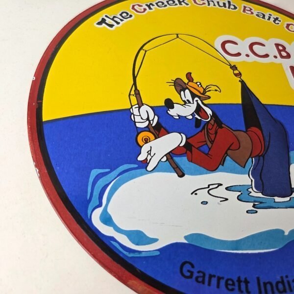 This vintage Creek Chub Bait Caster porcelain sign features a colorful design with the iconic Creek Chub Bait Caster lure with Goofy catching his own pants. Perfect for any outdoor fishing enthusiast or collector of gas and oil memorabilia, this sign would make a great addition to a cabin or garage. The sign is made of porcelain and features red, green, orange, and black colors.