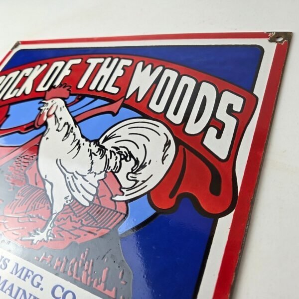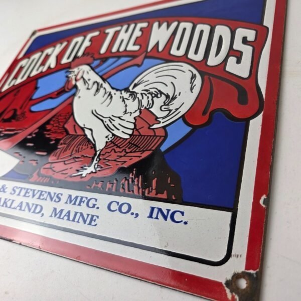 This vintage Cock of the Woods porcelain sign features the iconic Oakland Maine brand, Emerson & Stevens Mfg and measures 11″ x 9″. The sign has excellent glossy porcelain and colors.