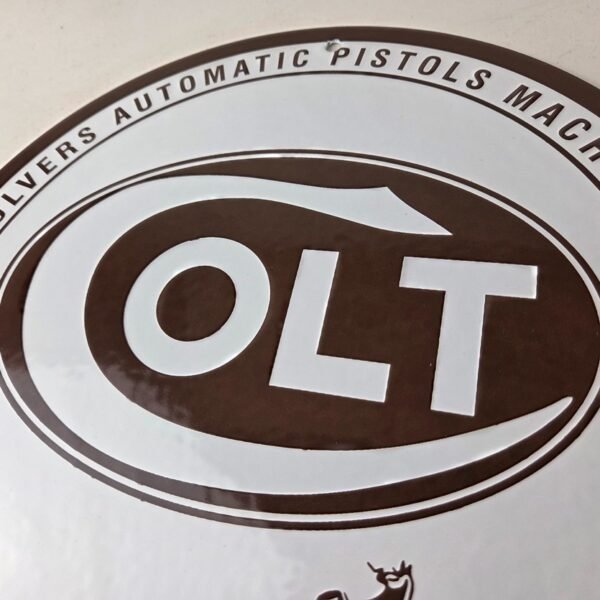 Add a vintage touch to your gas station or collection with this eye-catching Colt Firearms porcelain sign. Featuring a brown design, this 11 3/4-inch sign is a must-have for any gas and oil or advertising enthusiast.