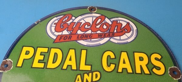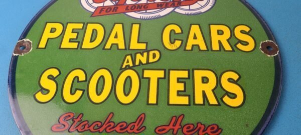 This vintage sign from Cyclops features the large lettering “Pedal Cars and Scooters” and is perfect for collectors of gas and oil memorabilia. Whether you’re a fan of vintage advertising or simply appreciate the history of pedal cars this sign is sure to be a conversation starter. It’s a great addition to any man cave, garage, or collection.