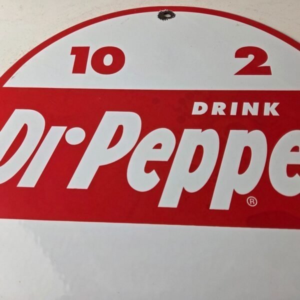 Add a vintage touch to your bar, man cave or soda collection with this stunning porcelain sign featuring the iconic Dr Pepper 10 2 4 advertising. The red color and gas & oil theme make it a perfect addition to any vintage advertisement collection.