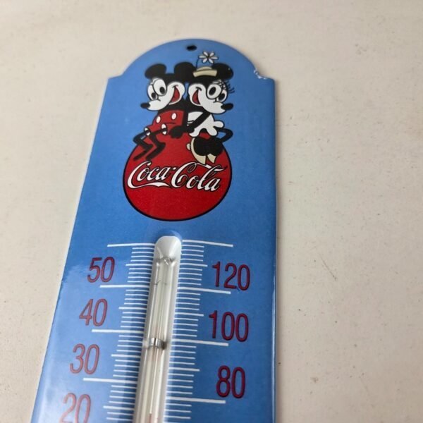 This vintage Coca Cola porcelain thermometer measures 11 3/4″ x 2 1/2″. This thermometer is a great addition to any collection. It features the iconic Coca Cola logo with Mickey & Minnie Mouse and has vibrant colors with excellent gloss.