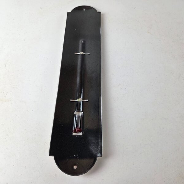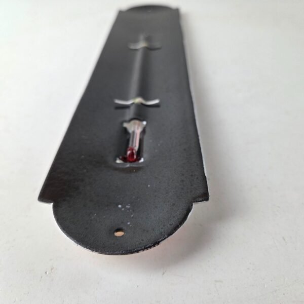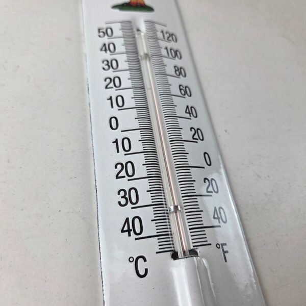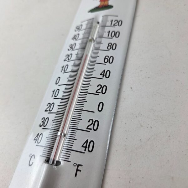 Made of porcelain enamel on steel with patina and wear: rust spotting around the mounting holes, minor edge chips, light surface scratches, and minimal discoloration. This is a porcelain enamel advertising thermometer in excellent condition, exactly as shown in the photos (thermometer functional as pictured).