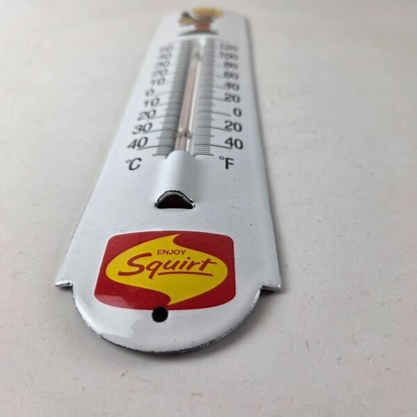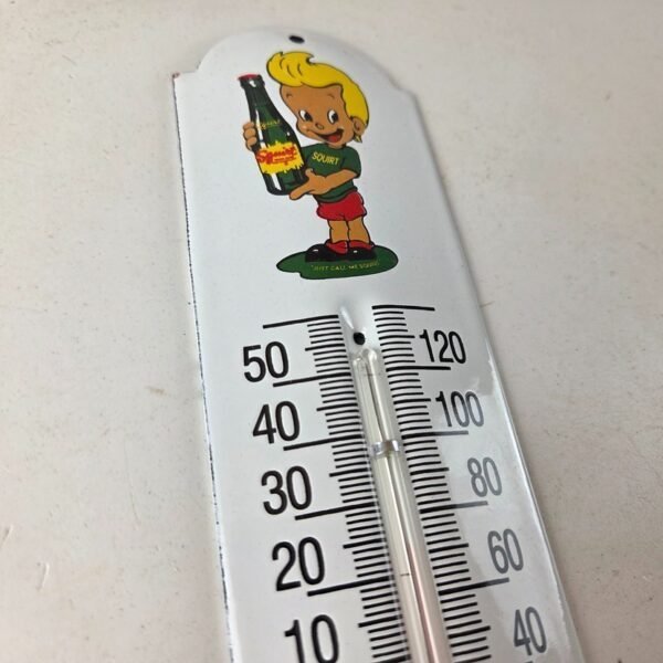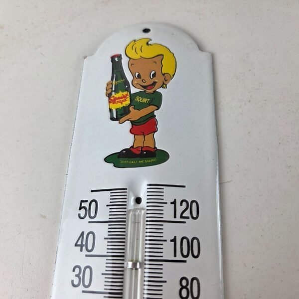 This vintage Squirt boy soda thermometer makes a great addition to a garage, shop display, man cave, kitchen, or any Squirt memorabilia collection, vintage soda advertising collection, retro thermometer sign collection, or 1950s-1960s soda pop collection.