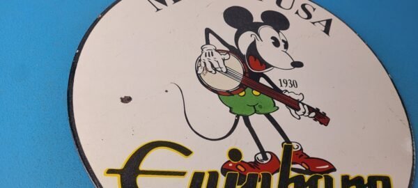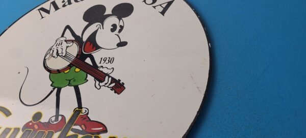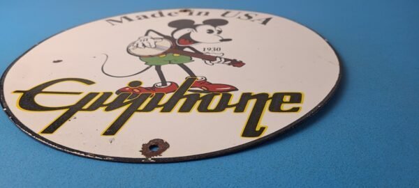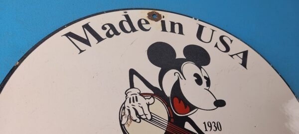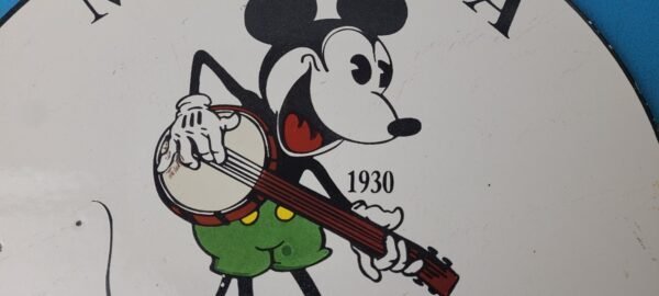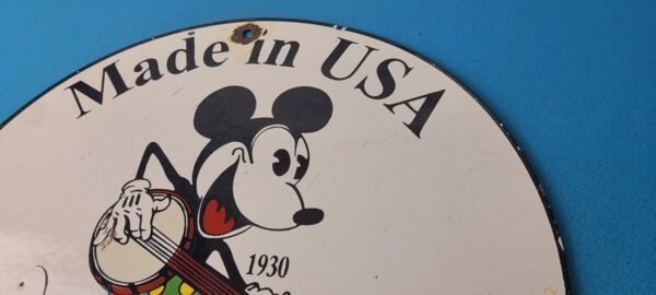 This vintage porcelain sign features a Epiphone Guitar with Walt Disney’s Mickey Mouse. The sign is 12″ in size and boasts vibrant colors and gloss. This sign will make a great addition to any collection and is sure to be a conversation starter. This sign will enhance your mancave, collection, shop, or garage.
