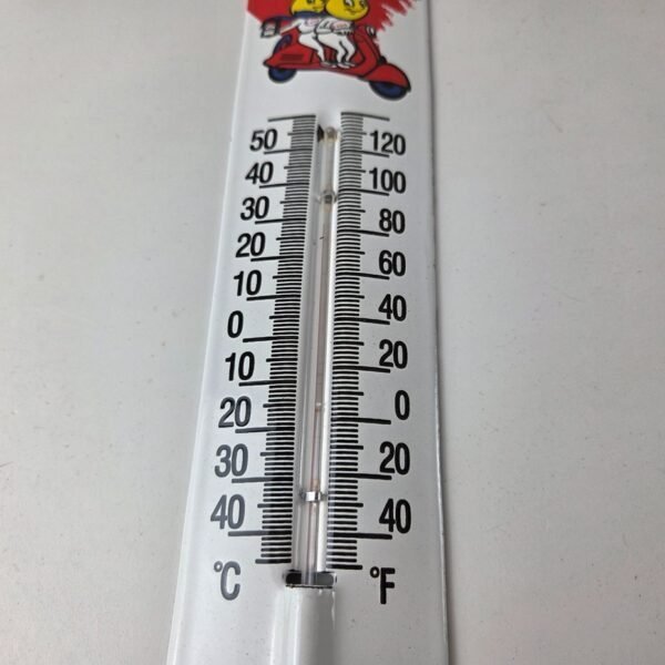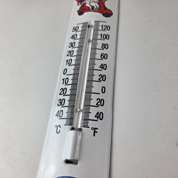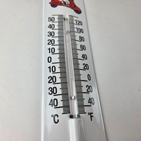 This vintage Esso Gasoline porcelain thermometer measures 11 3/4″ x 2 1/2″. This thermometer is a great addition to any collection. It features the iconic Esso Gasoline Scooter Oil Drop Boy and Girl at the top and has vibrant colors with excellent gloss.