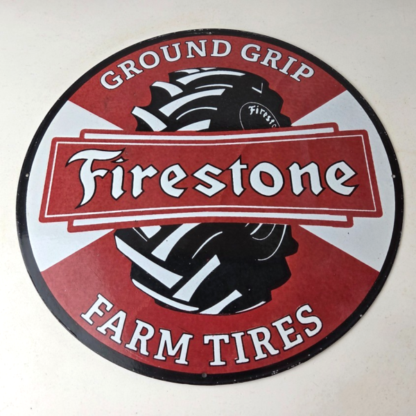This vintage Firestone Tires sign measures 12 inches across and features vibrant colors that are sure to catch the eye. This has the neat graphic of the Firestone Ground Grip Farming Tire.