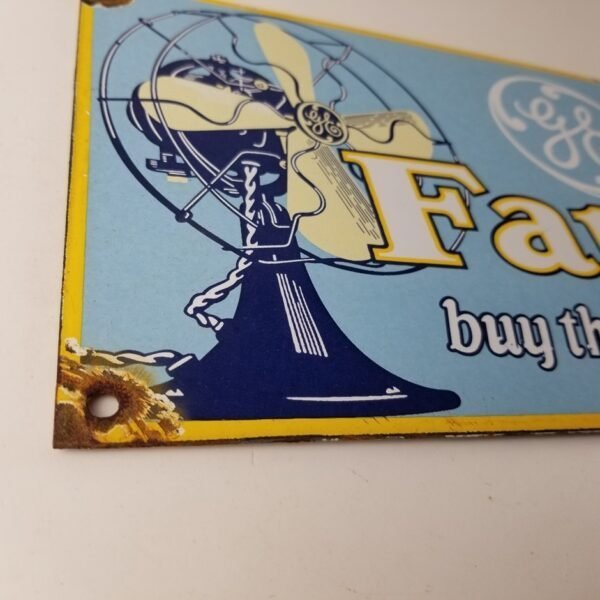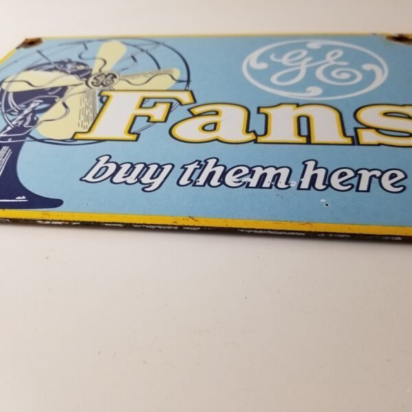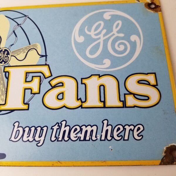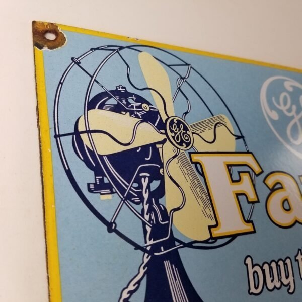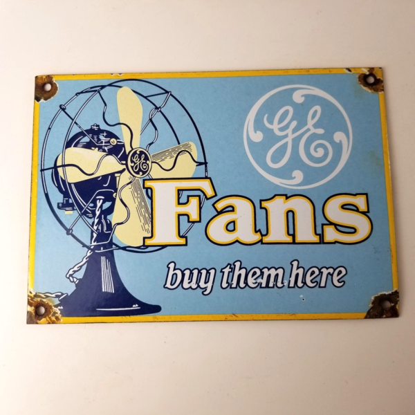 For sale is a General Electric porcelain sign featuring the electric Fan. Measuring at 10″ by 7″, this sign is the perfect size to display in your garage or man cave. The General Electric is well-known for producing quality fans and this porcelain sign is no exception.