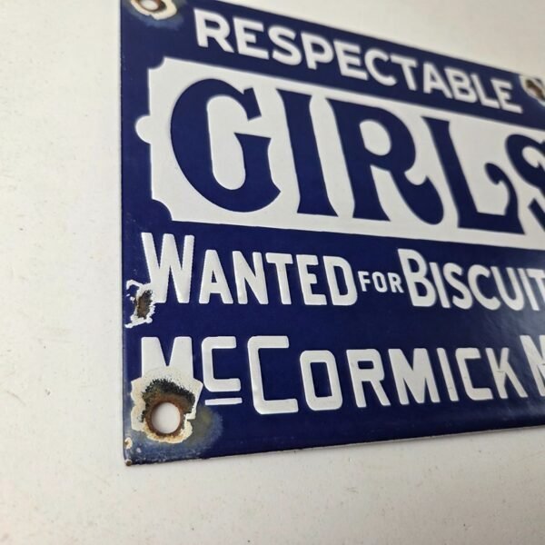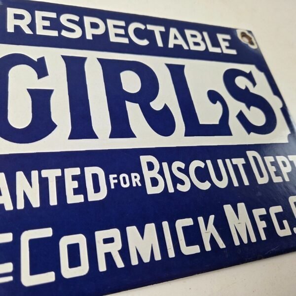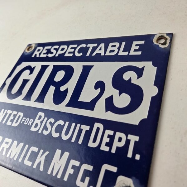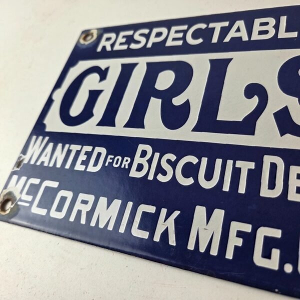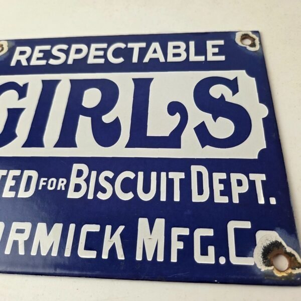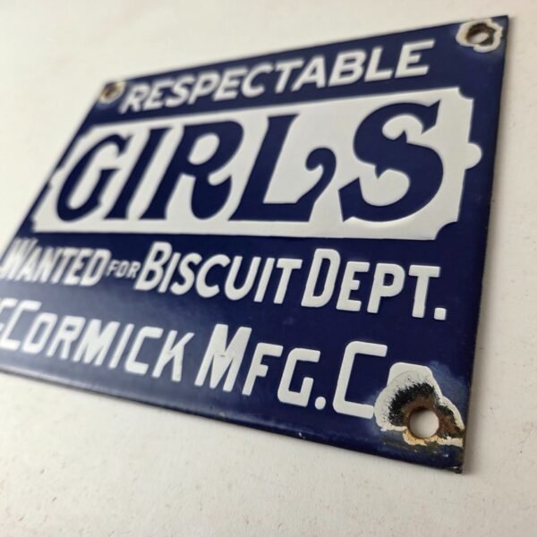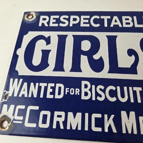 This is a vintage McCormick Manufacturing porcelain sign (also known as a McCormick porcelain advertising sign), measuring approximately 6 inches by 7 1/2 inches (rectangular shape). It features bold period lettering on deep blue: “RESPECTABLE GIRLS” in large white block letters with decorative framing, “WANTED FOR BISCUIT DEPT.” below, and “McCORMICK MFGG. CO.” at the bottom — a classic vintage biscuit factory advertising sign with humorous/quirky 19th-early 20th century labor recruiting.