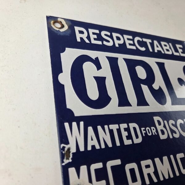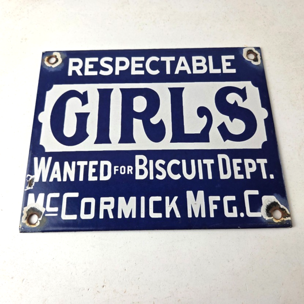 This vintage “Respectable Girls Wanted” McCormick sign makes a great addition to a garage, shop display, man cave, kitchen decor, or any vintage advertising collection, McCormick memorabilia collection, or antique factory/employment sign collection.