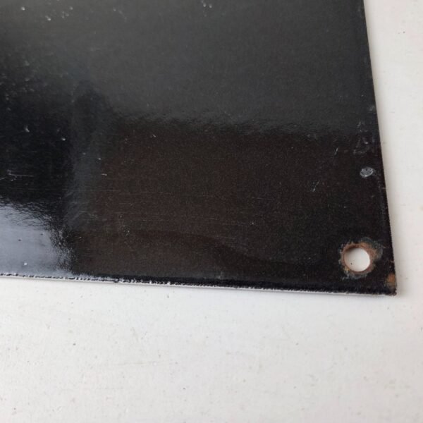 Made of porcelain enamel on steel with patina and wear: rust spotting around the mounting holes, minor edge chips, light surface scratches, and minimal discoloration. This is a porcelain enamel advertising sign in excellent condition, exactly as shown in the photos.