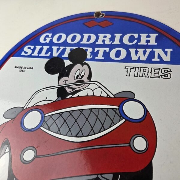 This vintage porcelain sign is a neat piece of advertising memorabilia. It features the iconic Goodrich Tires logo and is designed for use in gas service stations. The sign features the Goodrich lettering with Mickey Mouse in an old red automobile. The sign is perfect for collectors of gas and oil memorabilia, as well as people who need to fill their garage or shop.