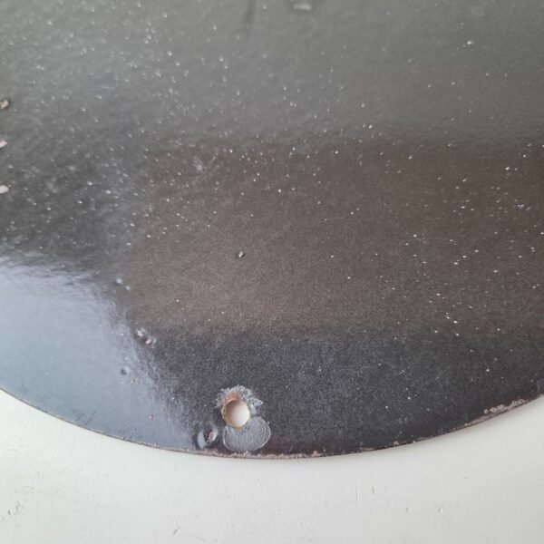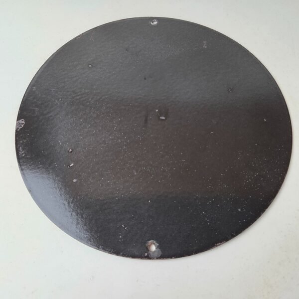 Made of porcelain enamel on steel with patina and wear: rust spotting around the mounting holes, minor edge chips, light surface scratches, and minimal discoloration. This is a porcelain enamel advertising sign in excellent condition, exactly as shown in the photos.