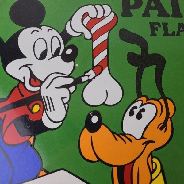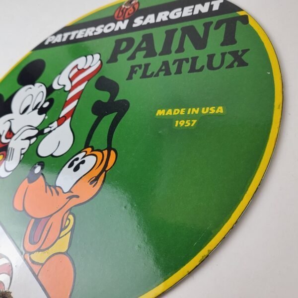 This vintage Patterson Sargent Paint porcelain sign is in excellent condition and has vibrant colors. This porcelain sign features the beloved Walt Disney cartoon character Mickey Mouse and the iconic Paint Brand.