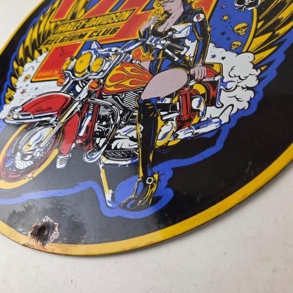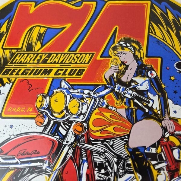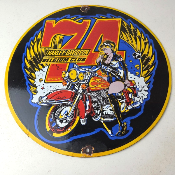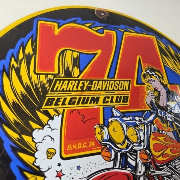 This vintage Harley Davidson Motorcycles porcelain sign features the iconic Harley Davidson Motorcycle and the pin-up girl, making it a must-have for any motorcycle enthusiast. The sign is made of porcelain and has the 74′ Belgium Club lettering.