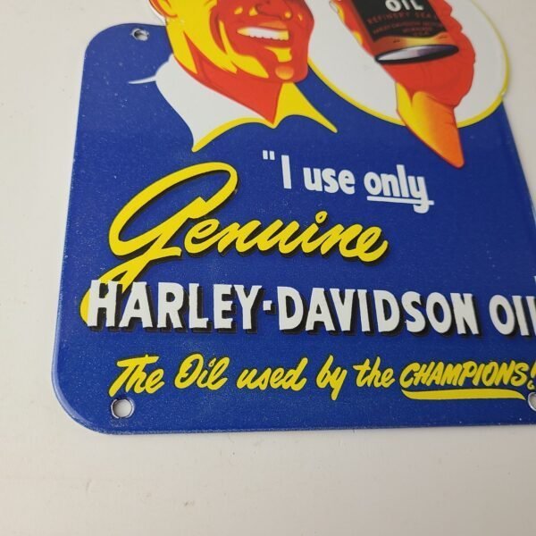 Displaying an iconic blue, orange and black color scheme, this vintage porcelain sign measures 8 1/4″ by 6 1/4″, this sign is the perfect addition to any gas & oil or automotive-themed collection. Add this impressive piece to your collection today. This sign will enhance your mancave, collection, bar, shop, or garage. It is your chance to own a piece of Harley advertising.