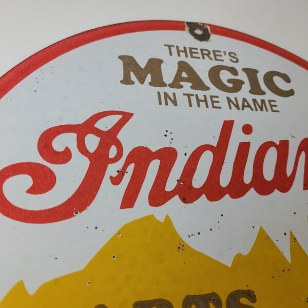 This vintage Indian Motorcycles porcelain sign features the Indian Chief with lettering at the top that says, “There’s Magic in The Name”. The sign measures 12″ in size and has porcelain on both sides.