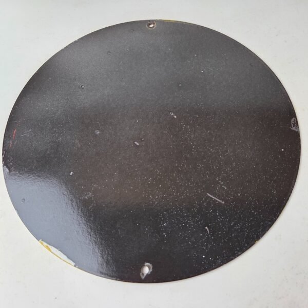 Made of porcelain enamel on steel with patina and wear: rust spotting around the mounting holes, minor edge chips, light surface scratches, and minimal discoloration. This is a porcelain enamel advertising sign in excellent condition, exactly as shown in the photos.