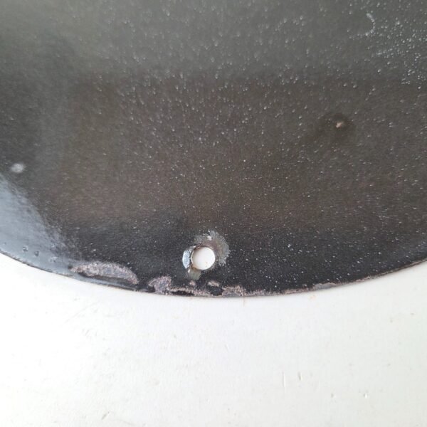Made of porcelain enamel on steel with patina and wear: rust spotting around the mounting holes, minor edge chips, light surface scratches, and minimal discoloration. This is a porcelain enamel advertising sign in excellent condition, exactly as shown in the photos.