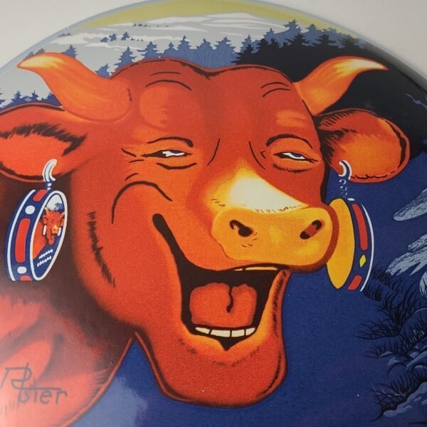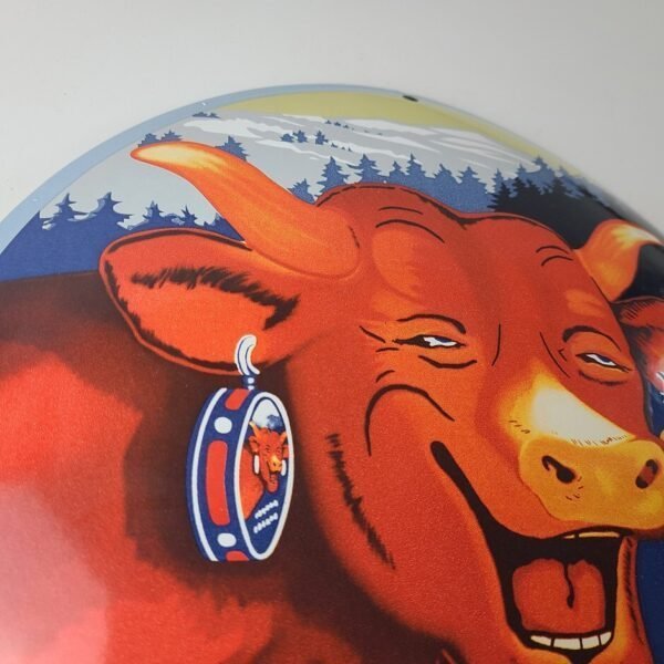 This vintage LaVache Qui Rit porcelain dome shaped sign features the iconic Cow, advertising for Dairy Cheese. Add a vintage touch to your gas station or soda beverage collection with this Borden’s sign. Measuring 11″, this sign has excellent colors and porcelain.