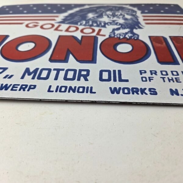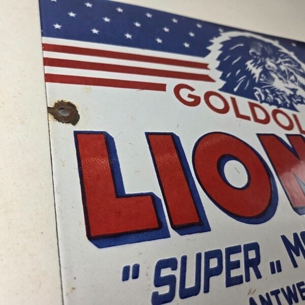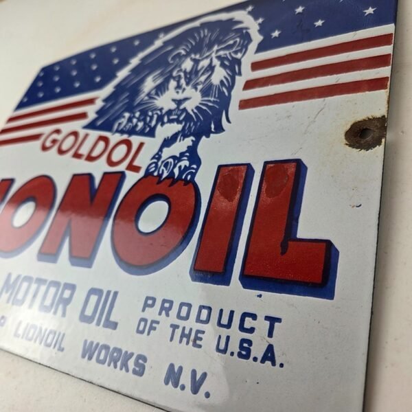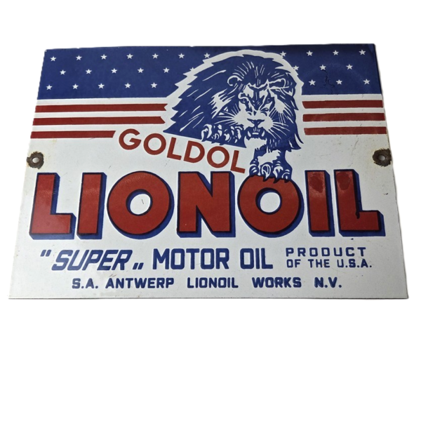 This vintage Lionoil Super Motor Oil porcelain sign features the iconic Goldol lion at the top. This sign has excellent large “LIONOIL” lettering and porcelain. The sign measures 12″ by 9″.
