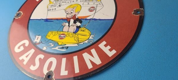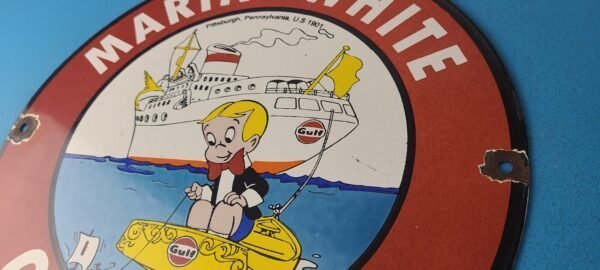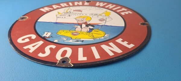 This vintage Marine White Gasoline porcelain sign features the iconic Marine White brand and showcases the famous Richie Rich character. Measuring at 12 inches, this porcelain gas sign is perfect for collectors and enthusiasts of gas & oil themed merchandise and memorabilia.