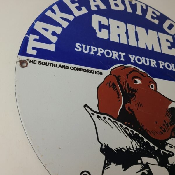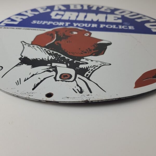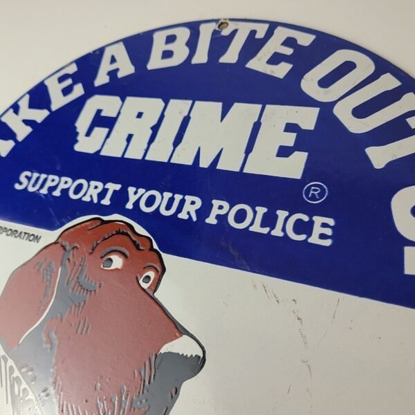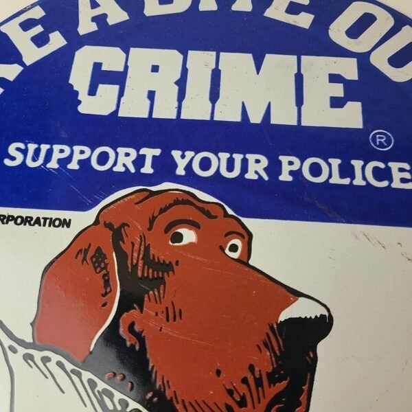 Vintage Take a Bite out of Crime Porcelain Sign.
