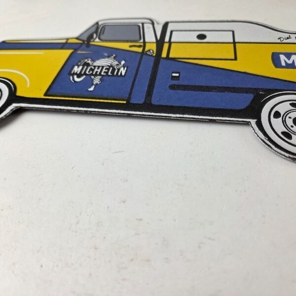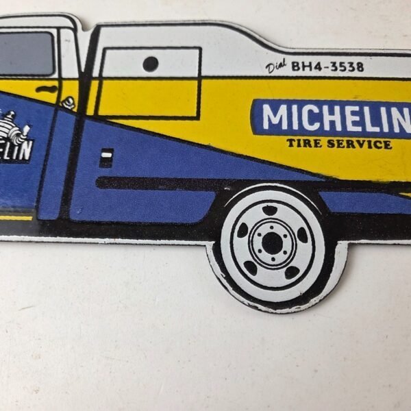 This vintage Michelin Tires porcelain sign features the Michelin service truck advertising for Michelin Tires. This porcelain gas sign has excellent gloss and colors.