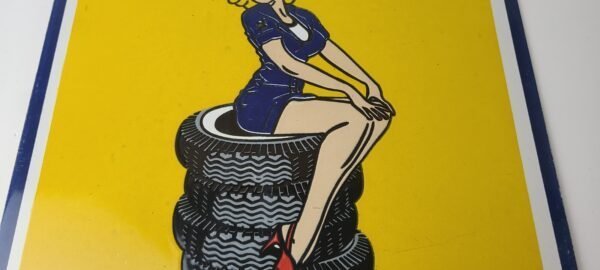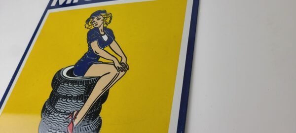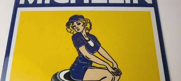 This vintage Michelin Tires porcelain sign features a pin-up girl graphic, set against a bright yellow and blue background. Measuring 11 3/4″ x 9 3/4″, this porcelain gas sign has a Chevron shape and is perfect for collectors of gas and oil memorabilia. It’s a great addition to any collection of advertising or vintage sign decor.