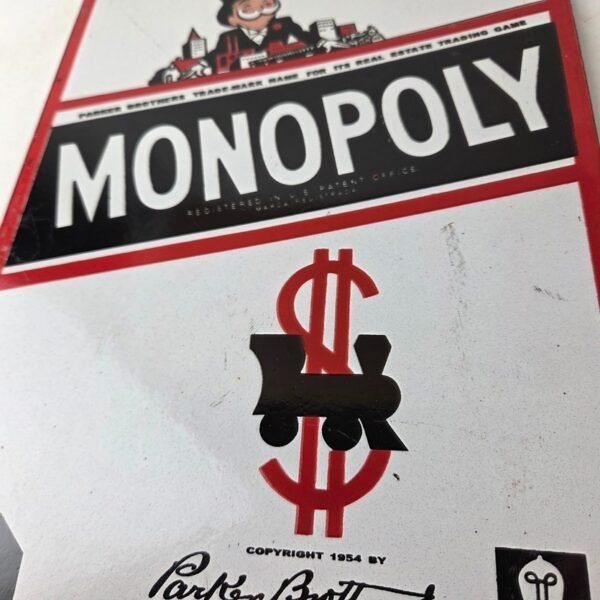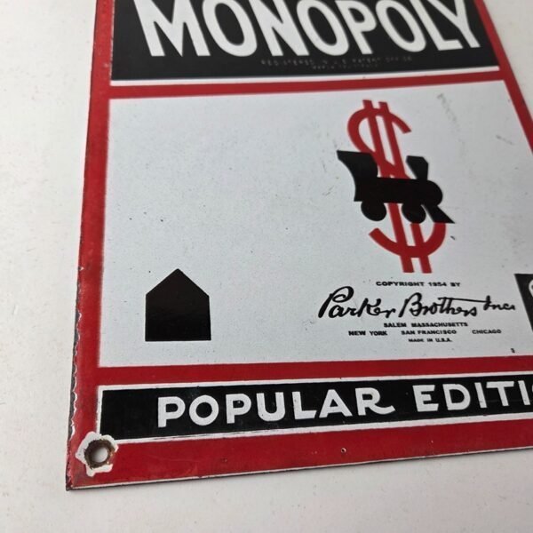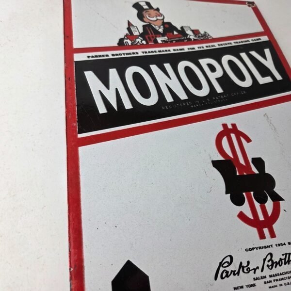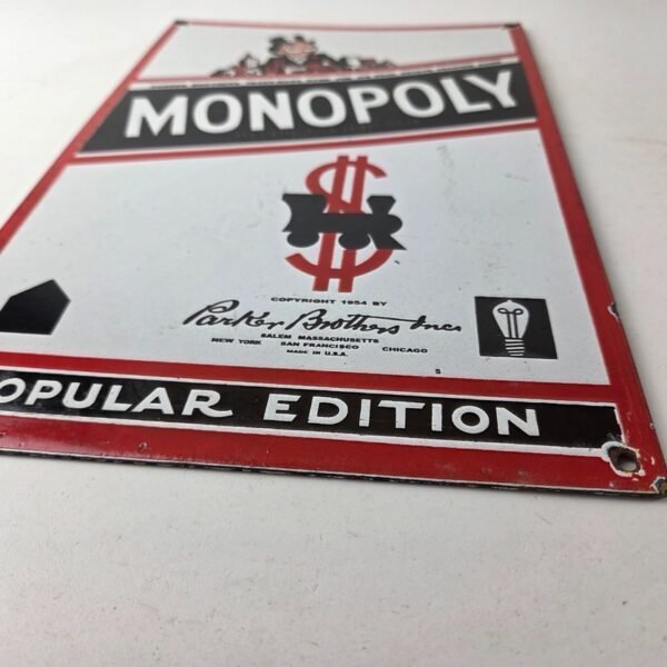 This vintage Monopoly Board Game porcelain sign features the iconic Board Game cover and showcases Mr. Monopoly at the top. Measuring at 12 inches by 8 inches, this porcelain gas sign is perfect for collectors and enthusiasts of gas & oil themed merchandise and memorabilia.