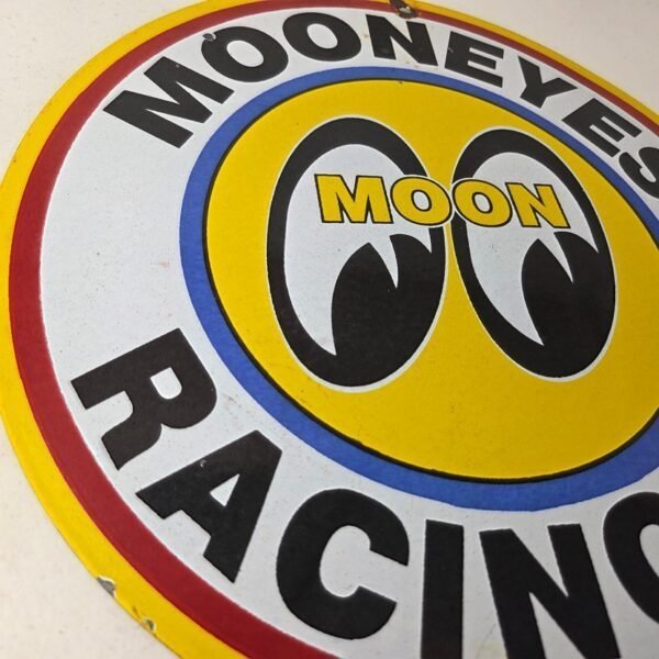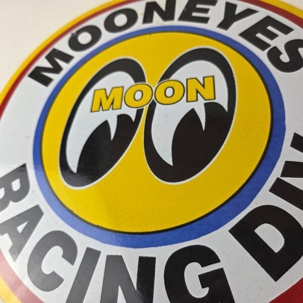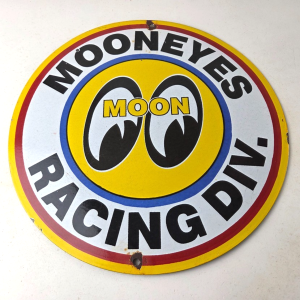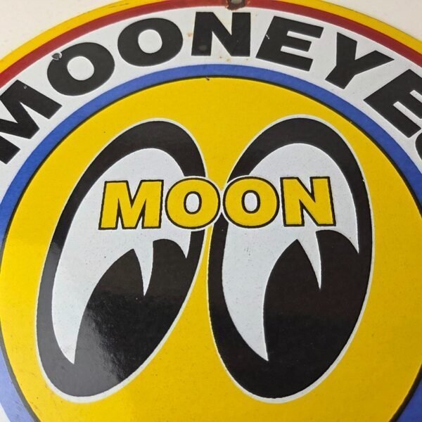 This vintage Moon Eyes Speed Equipment porcelain sign features large eyes in the center. The sign is made of high-quality porcelain and measures 12″ across.
