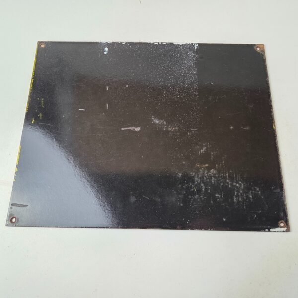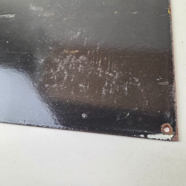 Made of porcelain enamel on steel with patina and wear: rust spotting around the mounting holes, minor edge chips, light surface scratches, and minimal discoloration. This is a porcelain enamel advertising sign in excellent condition, exactly as shown in the photos.